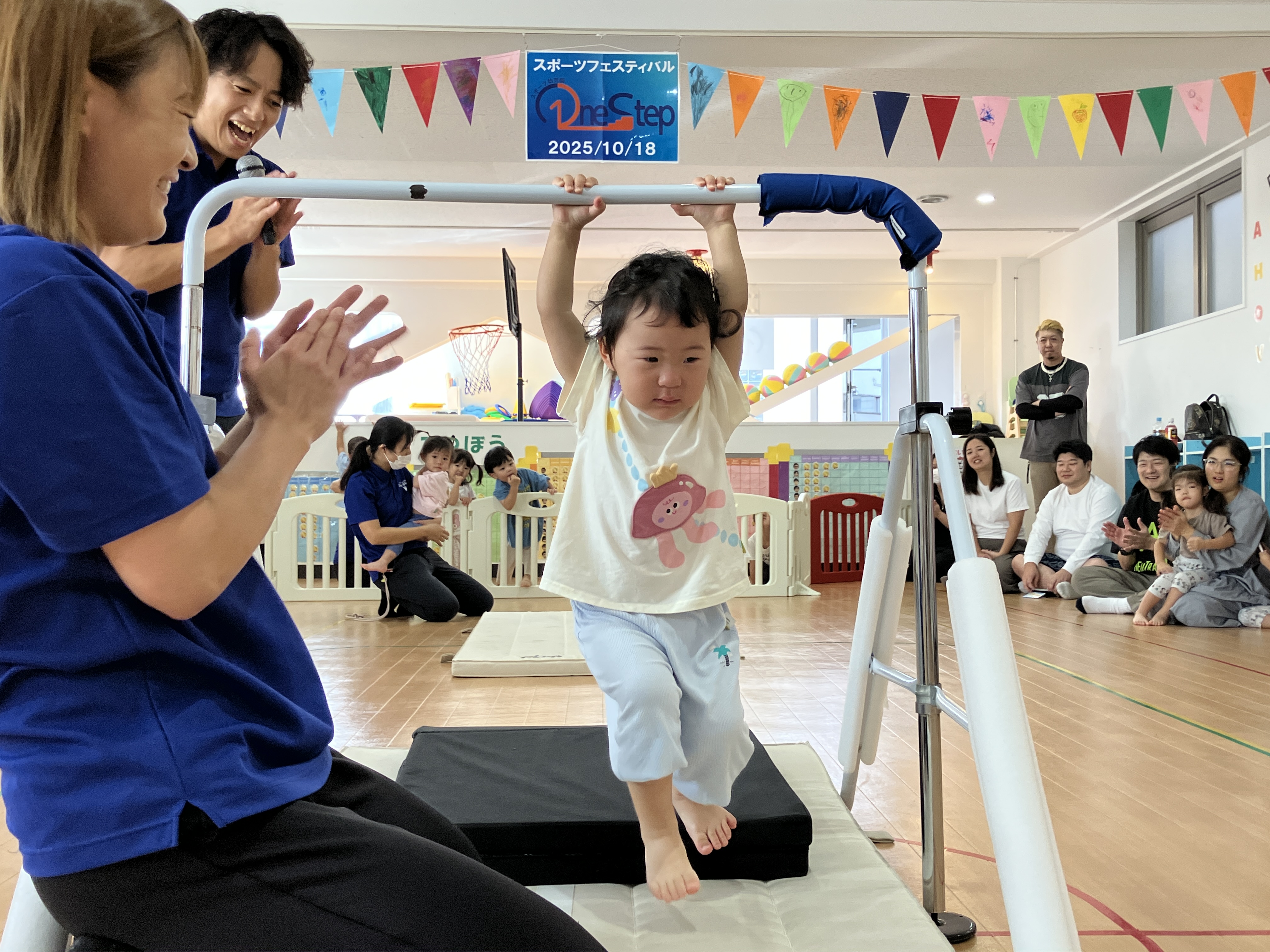 まだ1・2歳児の子どもたちは器械体操ができることよりも、ママパパのもとを離れて見せようとする