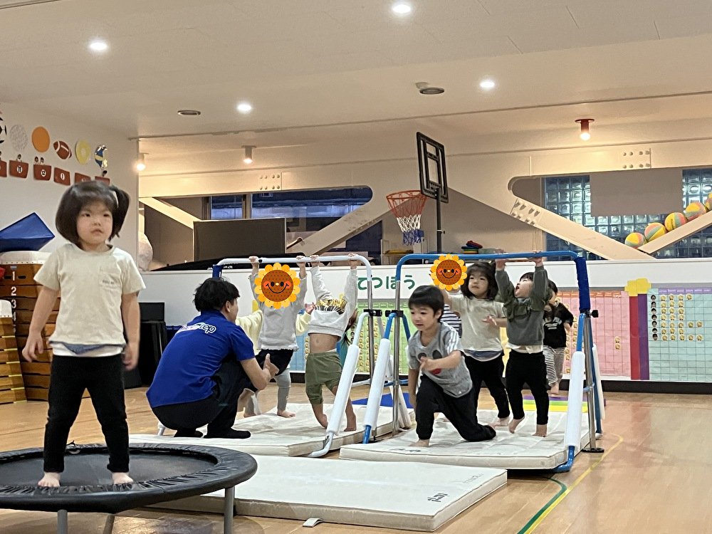主に1・2歳児が楽しんで体操教室に参加できるように簡単な運動や、後々通常の体操教室に進められるように器具に触れて簡単な技の習得を目指します