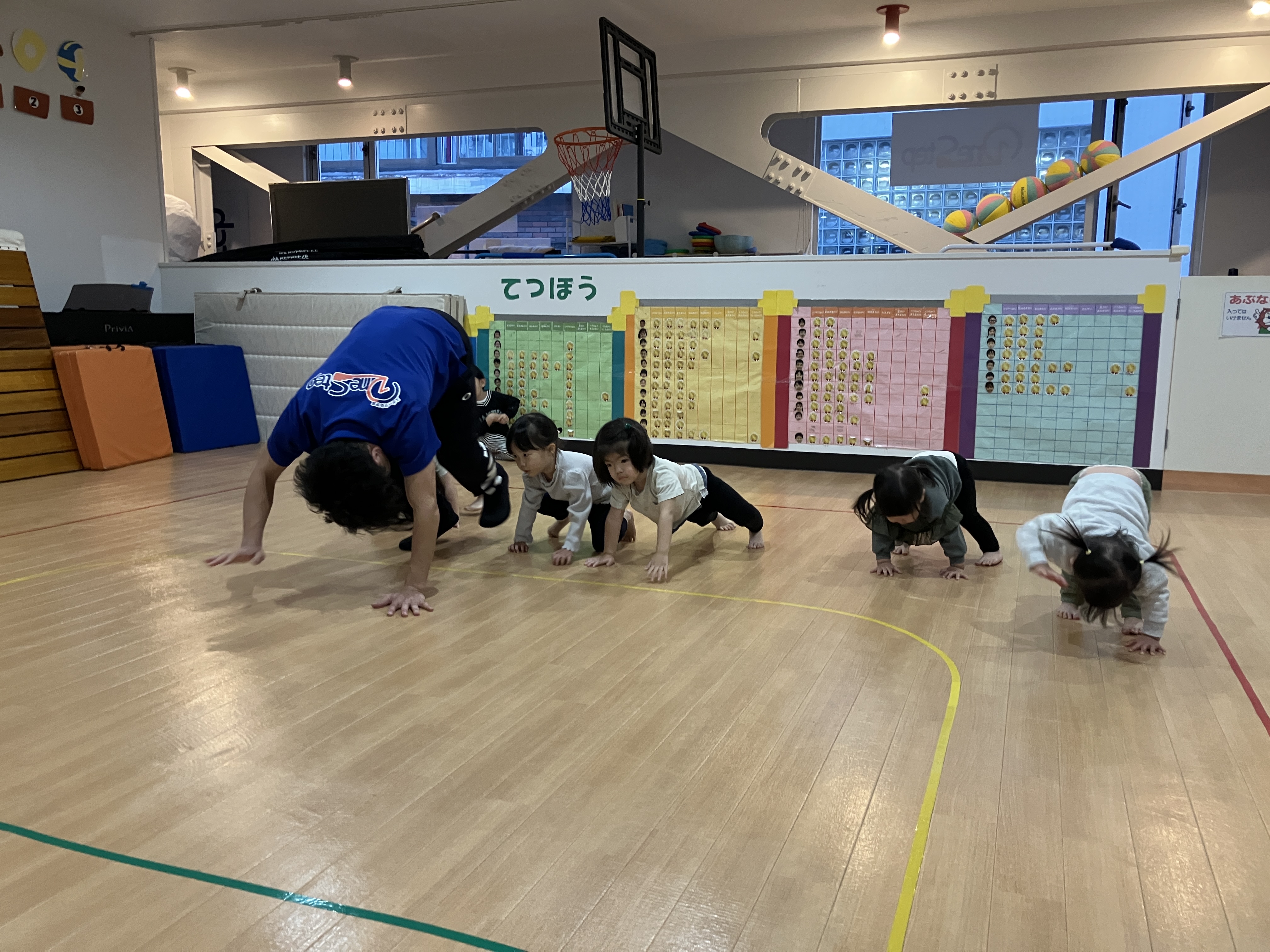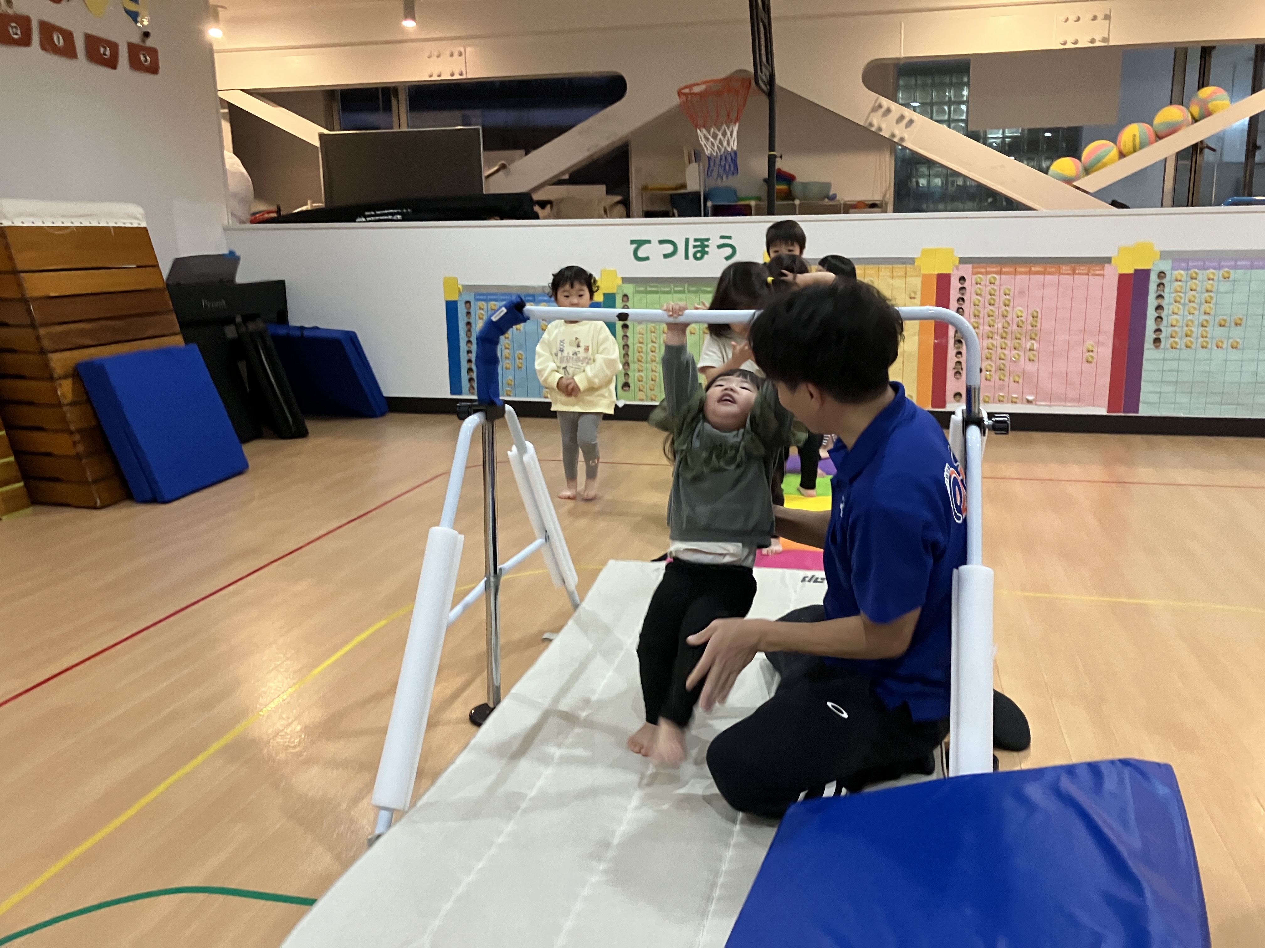 主に1・2歳児が楽しんで体操教室に参加できるように簡単な運動や、後々通常の体操教室に進められるように器具に触れて簡単な技の習得を目指します