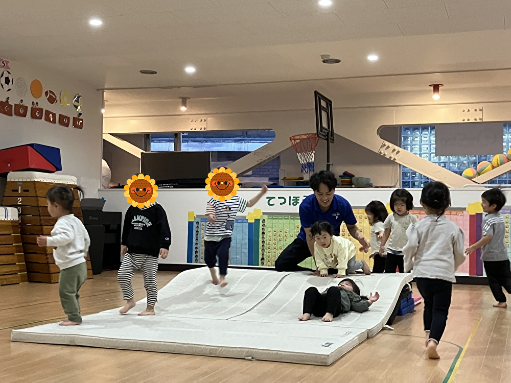 マットでゴロゴロしたり、飛び跳ねたり、でんぐりしたり・・・