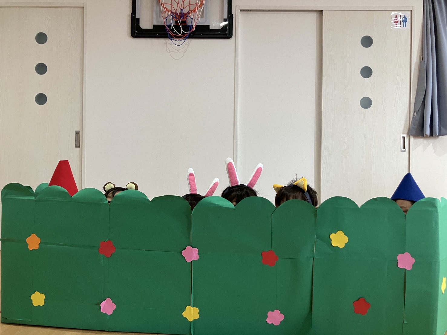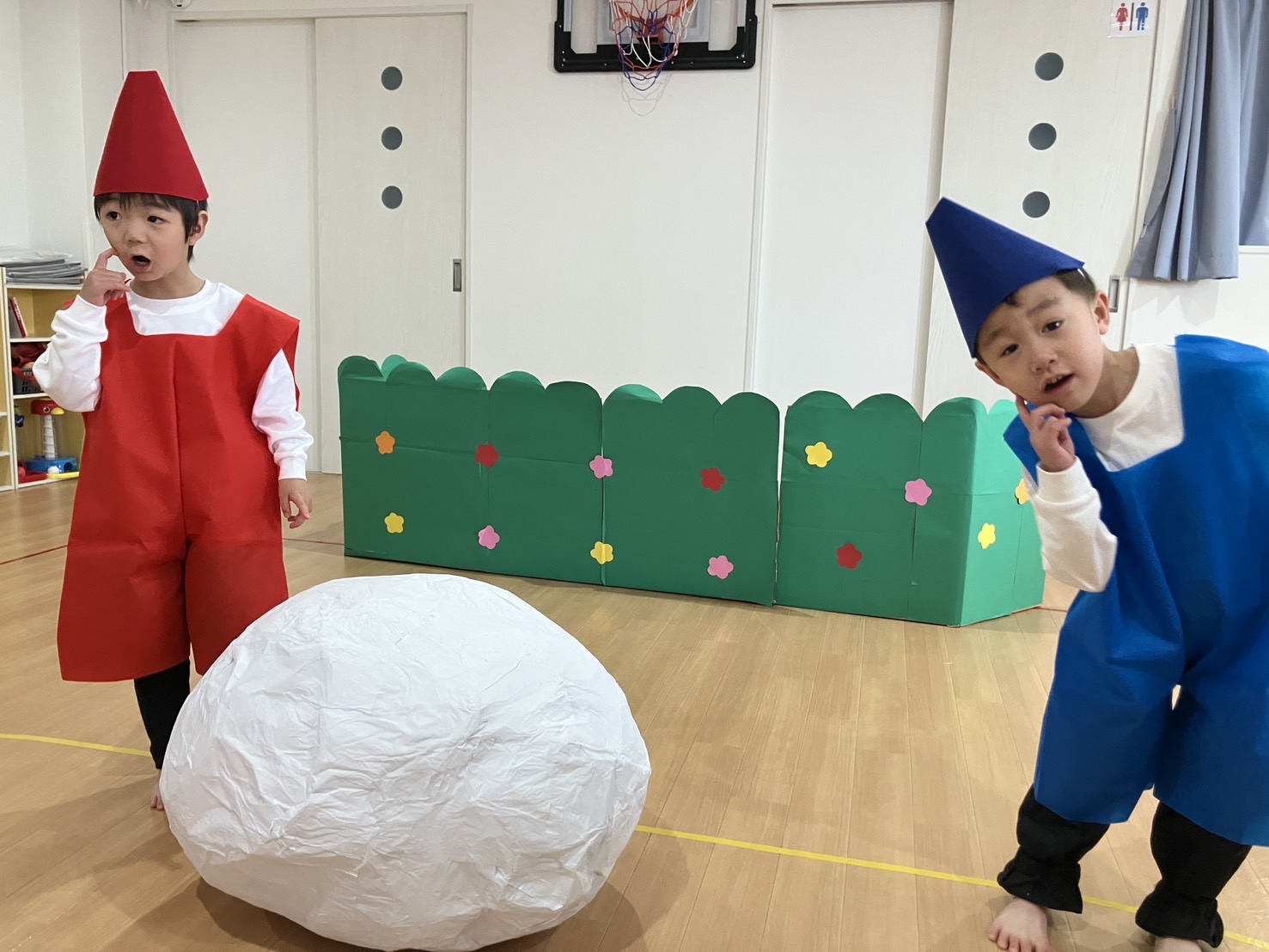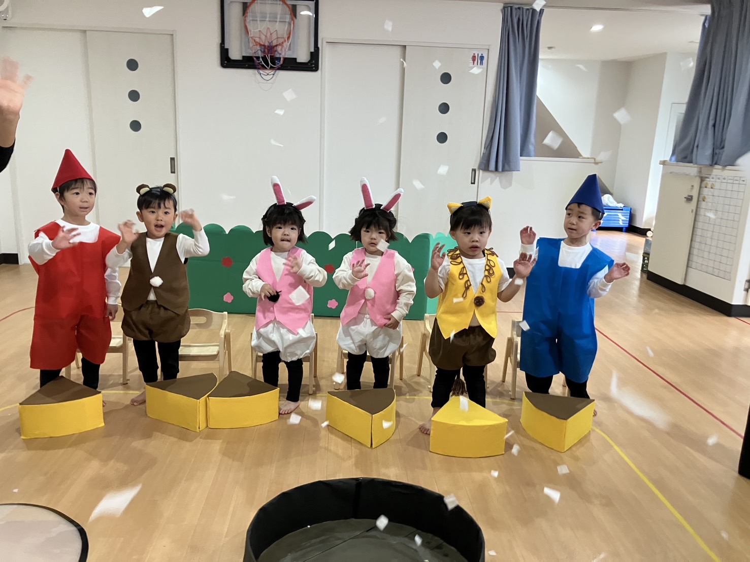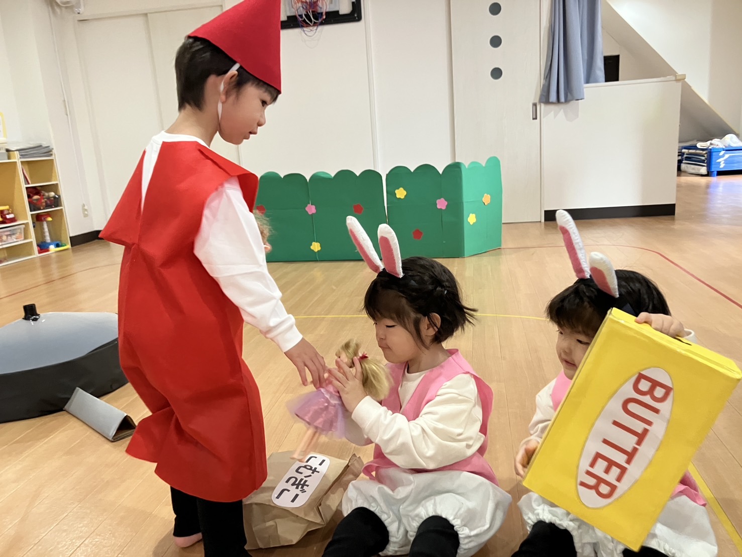 3歳児はたくさんのセリフを覚えられて言うことができたね!15分程度のお芝居を成立させることができました