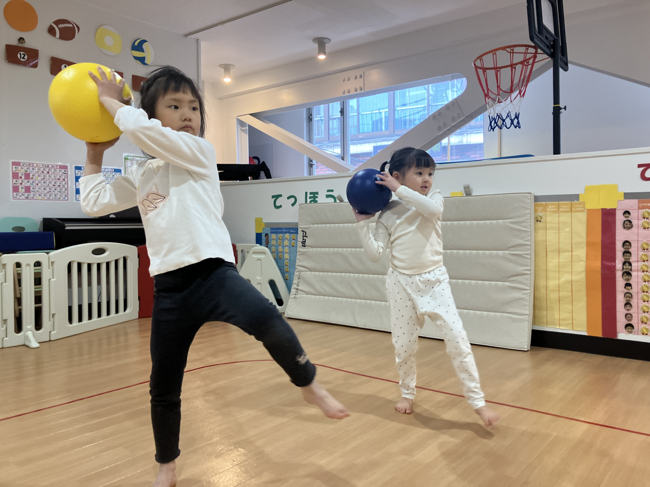 体操教室では、走る、跳ぶ、投げる、捕る、打つ、蹴る、バランス、リズム感、等を養う為にマット運動や鉄棒、跳び箱、ボール等、様々な運動器具を用いて楽しく身体の使い方を覚えます。